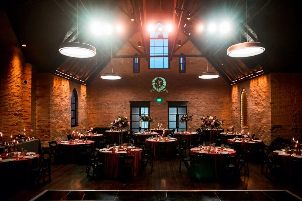 Katie + Ryan’s wedding theme and colors were inspired by the venue: Clementine Hall! The event definitely had a vintage vibe. We kept the event dark and moody, using black and rose gold with rich burgundy, navy and green. We also used marble chargers and dessert plates. It all came together so beautifully!