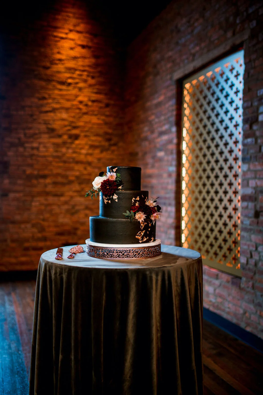 There were so many personal details in their wedding! Katie + Ryan love donuts and served a variety of donuts from East Nashville's Status Dough on a donut wall provided by The Perfect Little Life. They also paid a wonderful tribute to family and friends who have passed with signage from White Ink Calligraphy. Katie wanted a black cake and Copper Whisk made the most delicious, beautiful two-tiered black cake with rose gold leaf accents.