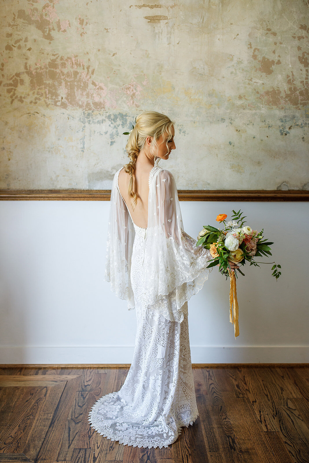 Inspiration for wedding design can be found in many places. Often times, we use the venue or the natural surroundings to inspire our client’s weddings or styled shoots. So, when Josh of J.Jackson Mobile Mixologist got 6 wedding planners and venues on board to create some new content during this events “dry spell” known as COVID-19, I was thrilled to be included! And what should I used for inspiration at the gorgeous Wilburn Street Studio but their custom bar, of course! Their custom bar has a beautiful wooden inlay that reminds me of two things: the 70s and the Pacific NW (where I am from!) so I used that as a theme. Pairing a bright, textured linen from Liberty with some warm, wooden items and some glitzy gold-rimmed china. And nothing says the 70s like velvet! Velvet linens and antique chairs brought it all together. And then, let’s talk about that cake! This is on my favorite parts of this entire design! I wanted the cake to suit the venue and use the bar as inspiration so the team at Baked in Nashville matched the beautiful walls at Wilburn with the wood design on the bar to create this custom look!